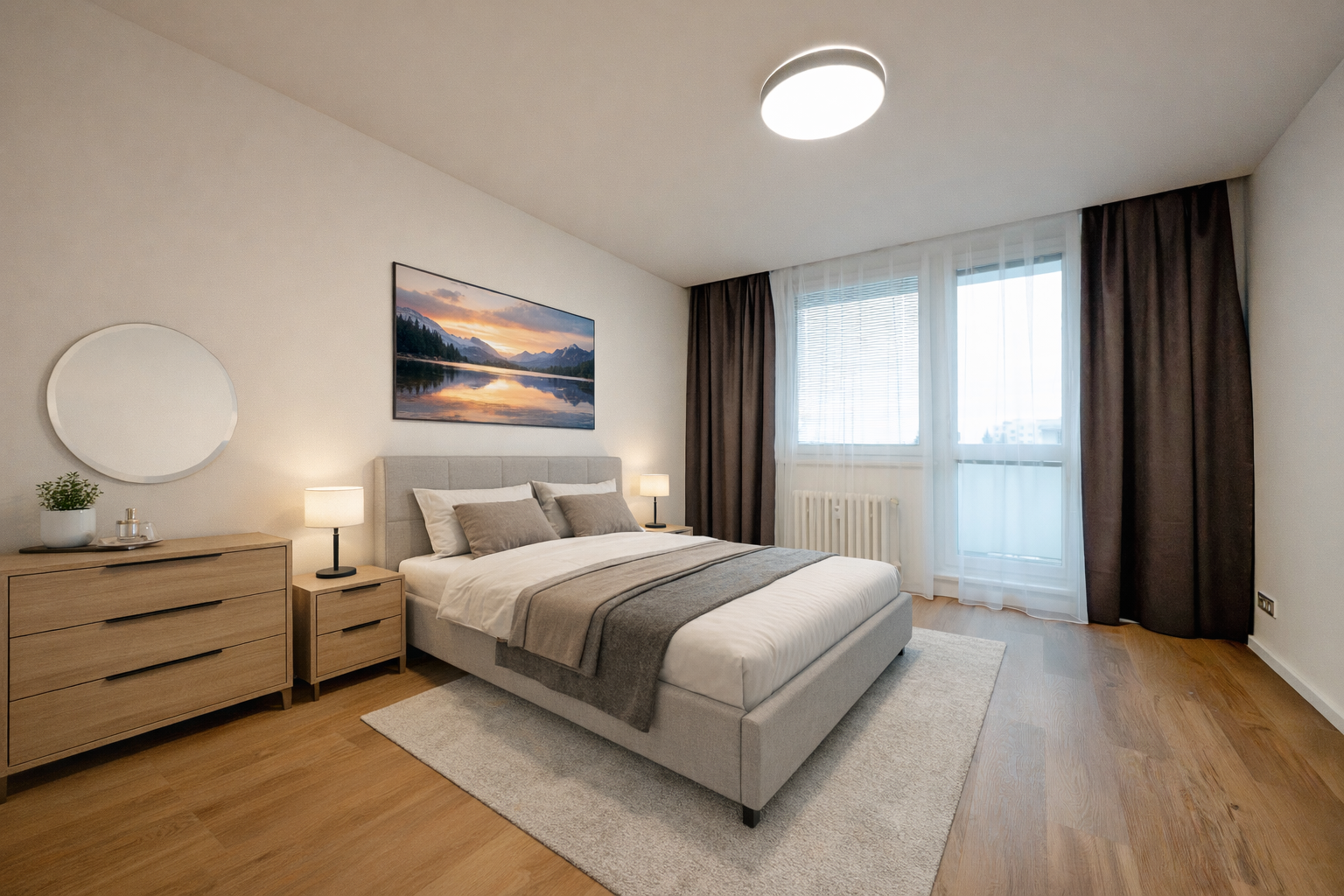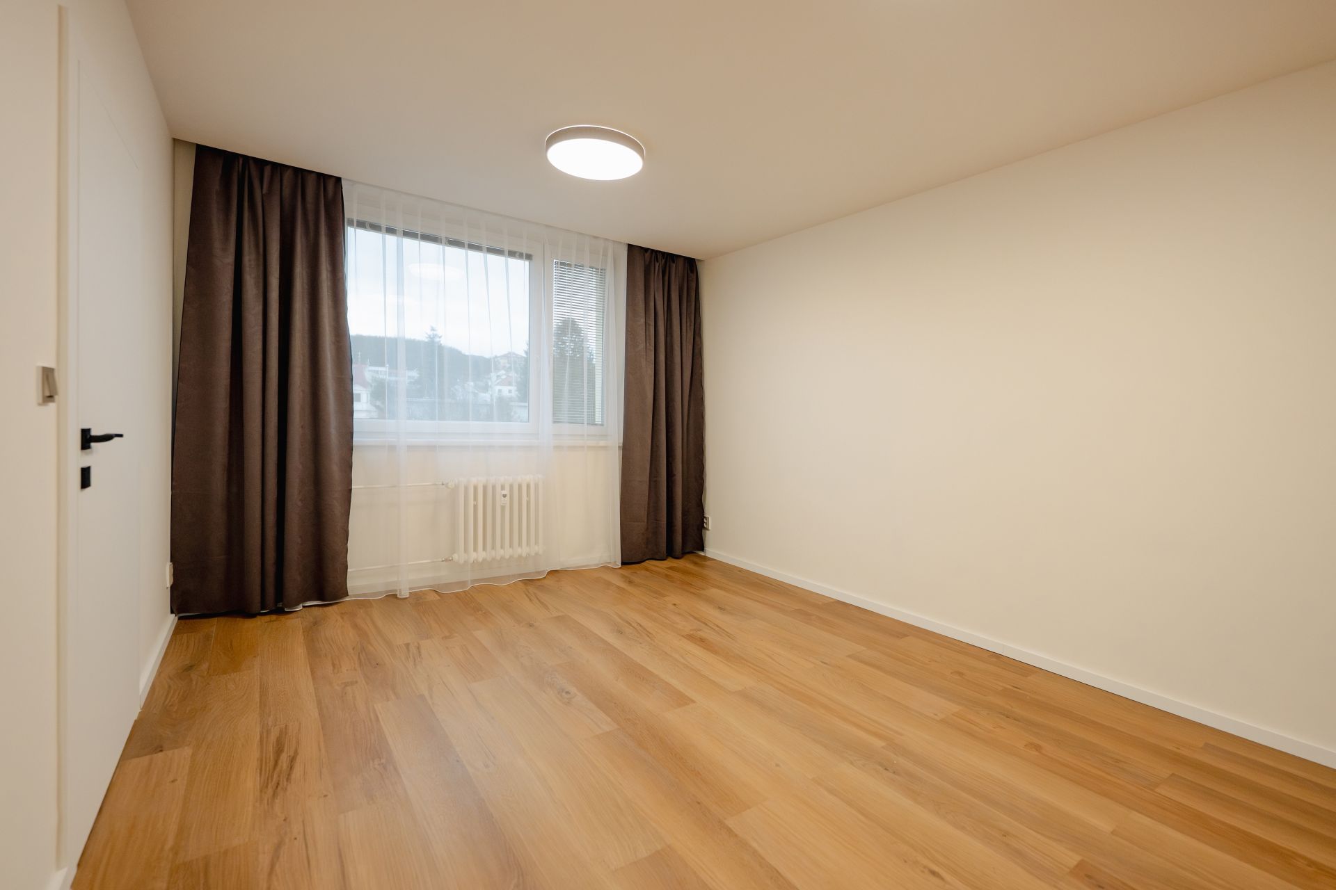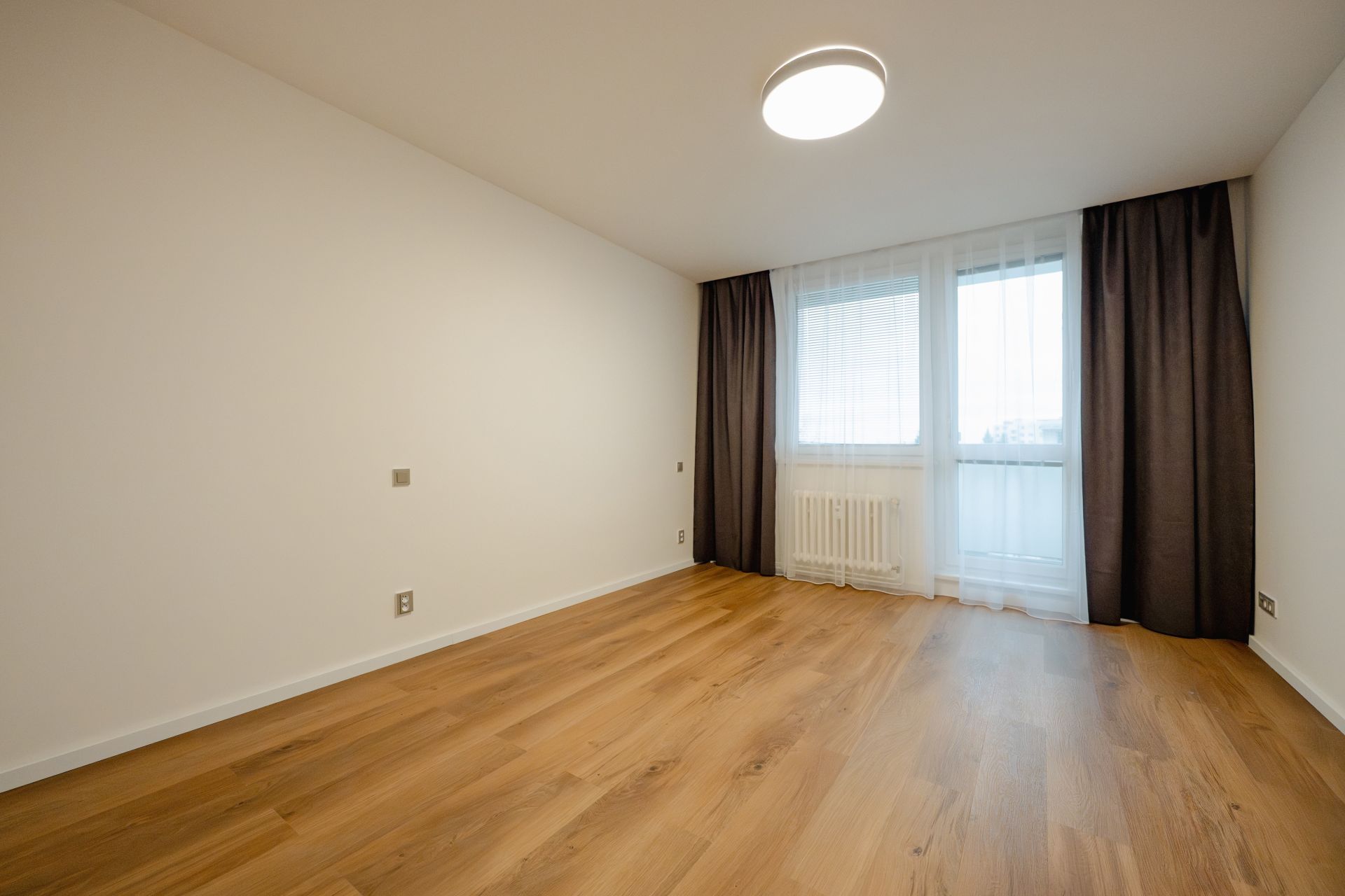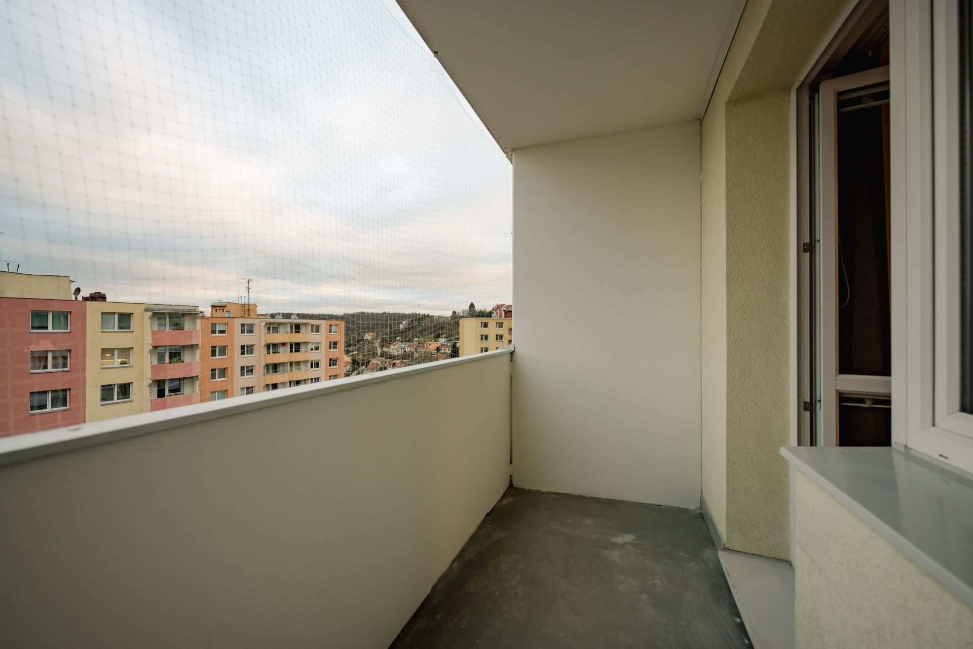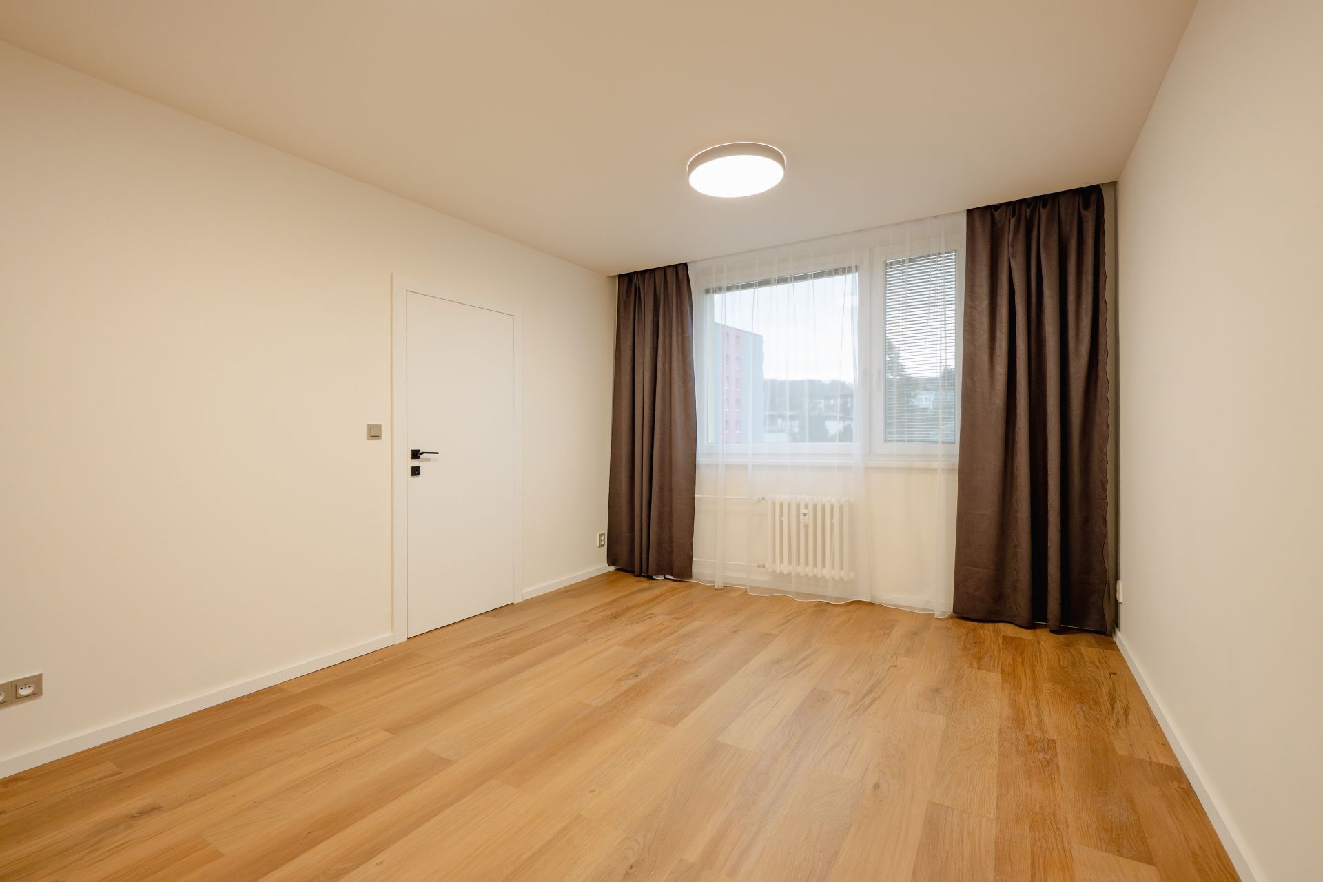 Ložnice 15 m2 orientovaná na východ se vstupem na balkon a výhledem do zeleného vnitrobloku.