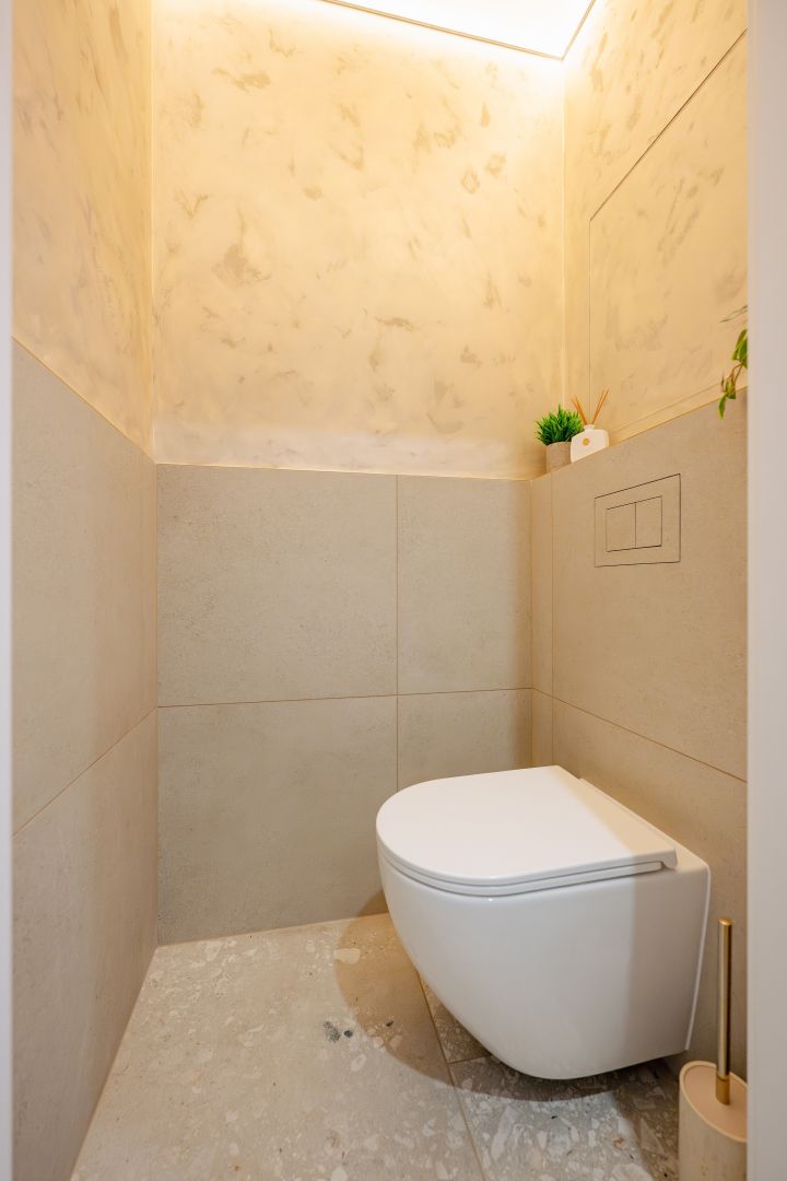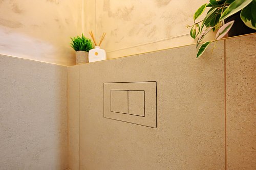 Toaleta s vírovým splachováním (hygienické, úsporné řešení), tlačítko elegantně zapuštěné v obkladu.