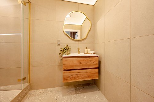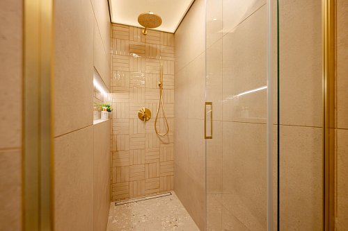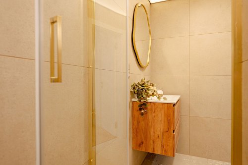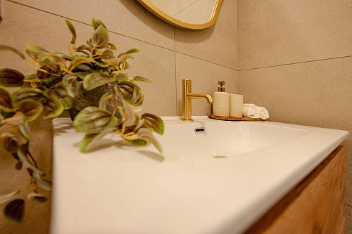 Koupelna s prostorným sprchovým koutem 5 m2, umyvadlem a přípravou na pračku a sušičku. Samostatná toaleta 1 m2.