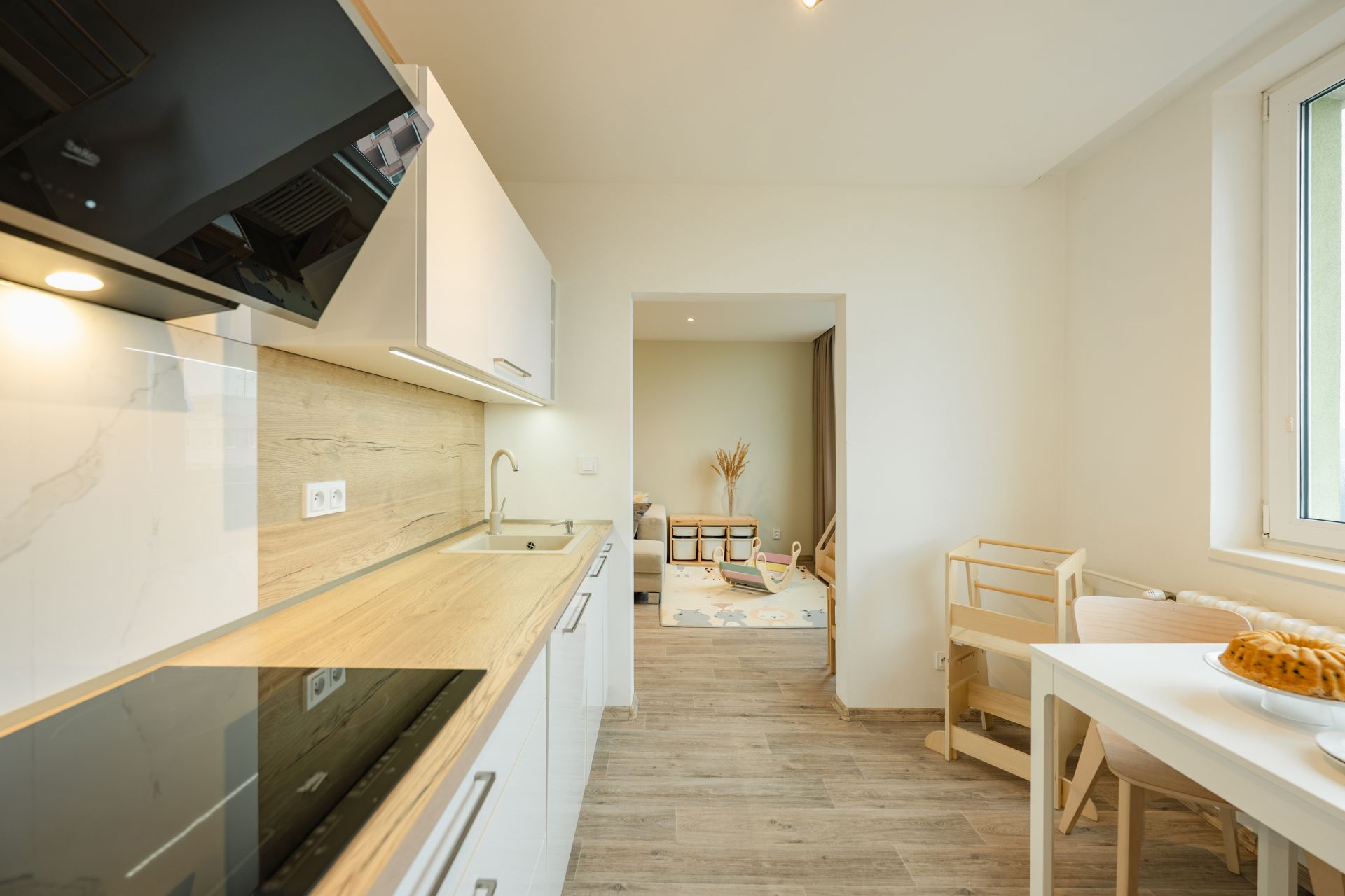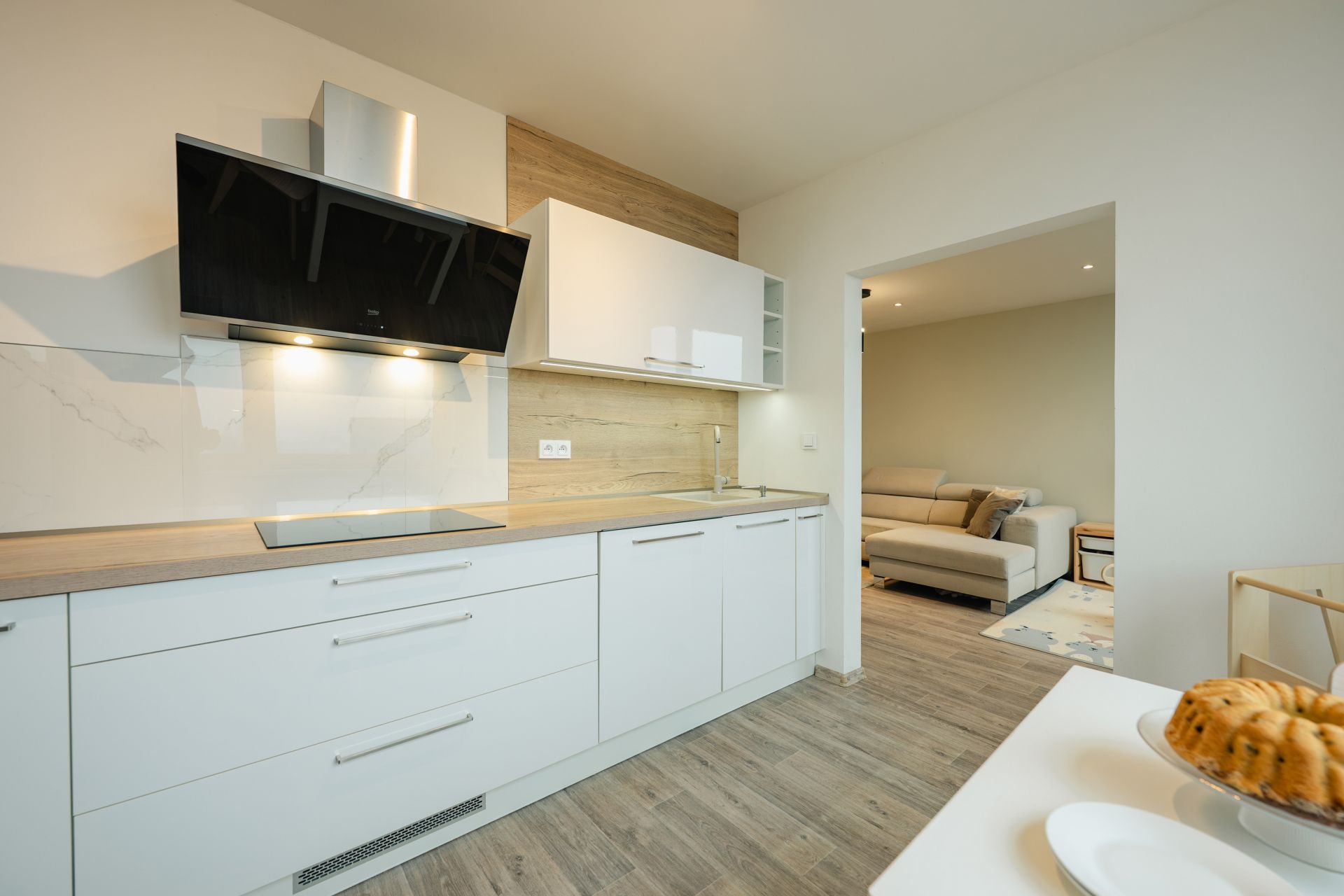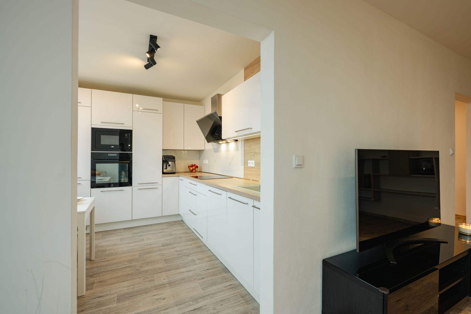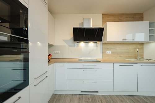 Kuchyň zn. Oresi navazuje na otevřenou obytnou část. Nabízí moderní design se zabudovanými spotřebiči (indukční deska + mikrovlnka Beko, trouba Electrolux, lednice Liebherr, odsavač Beko).