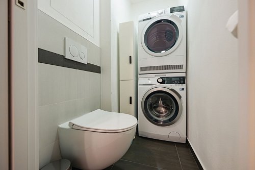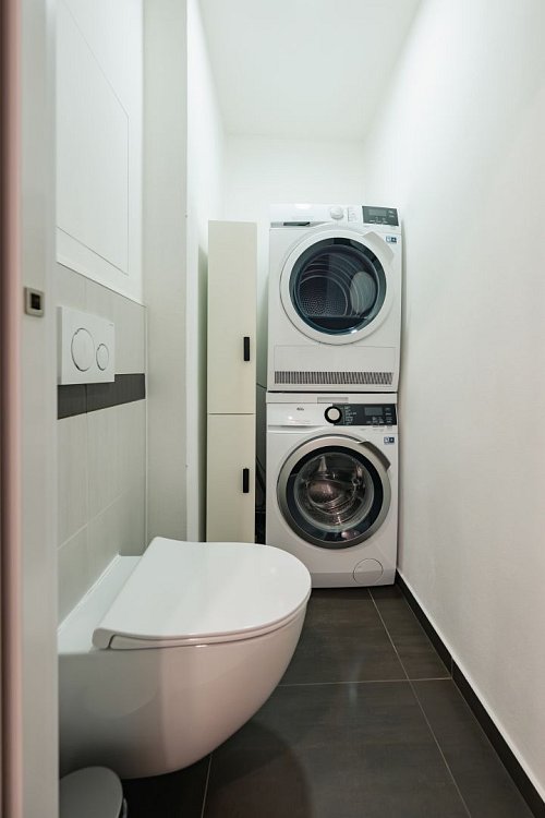 Závěsná toaleta, vestavěný systém (Geberit), bezrámečkové řešení. Je zde umístěna také pračka/sušička LG.