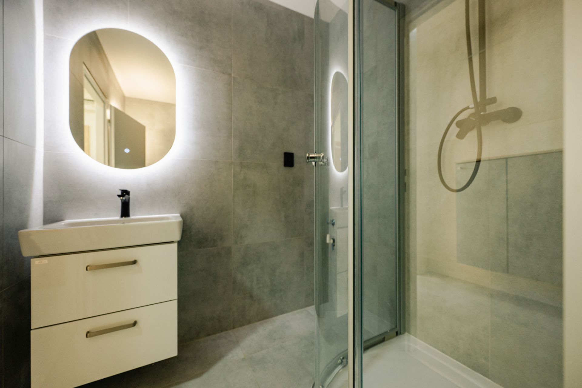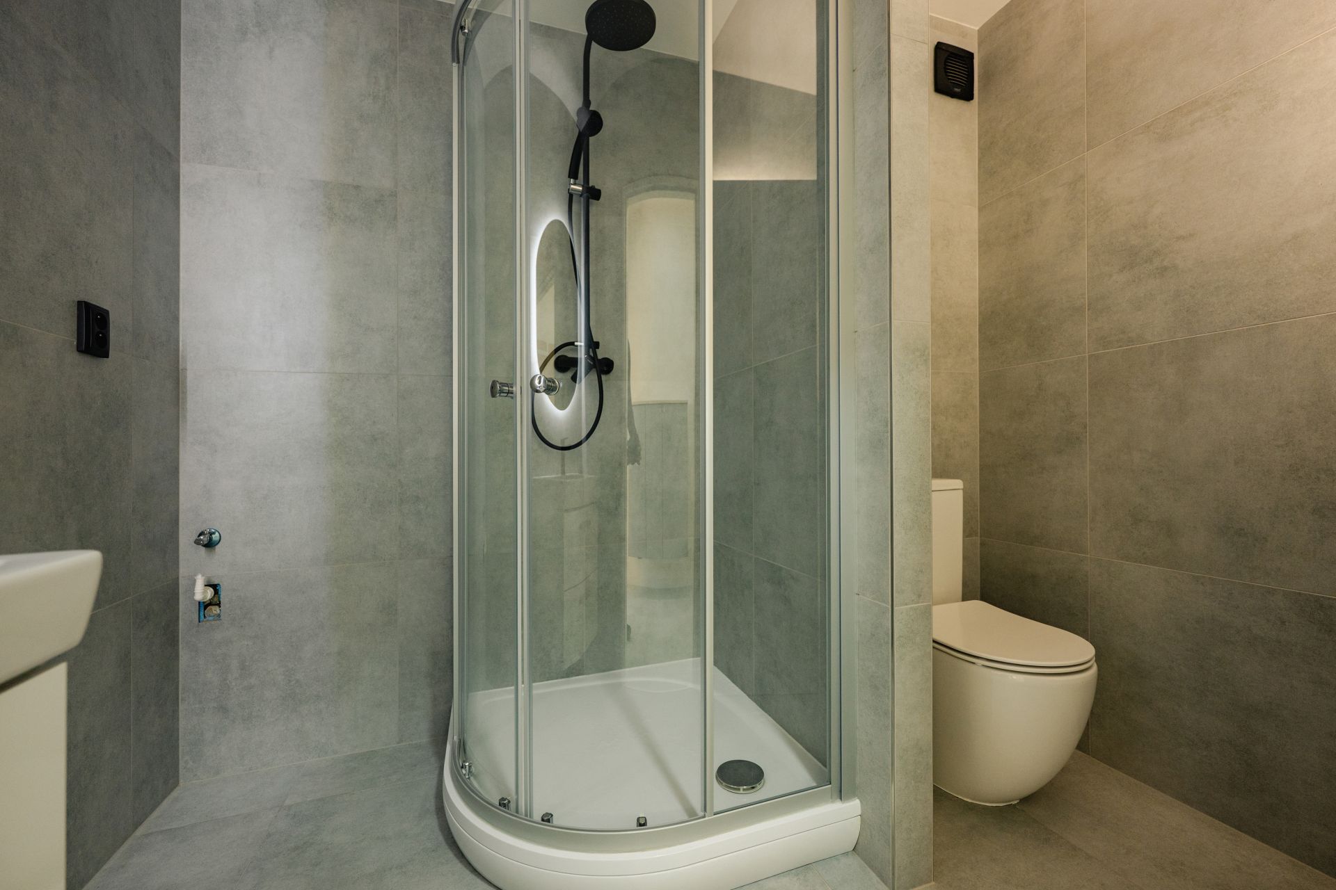 V koupelně sprchový kout, umyvadlo, toaleta, vývod na pračku.