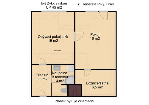 Dispozice 2+kk s nikou, podlahová plocha 45 m2