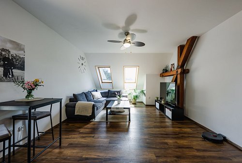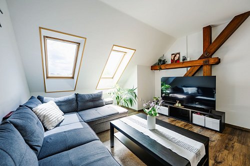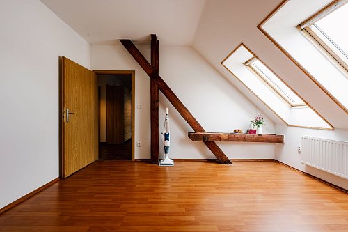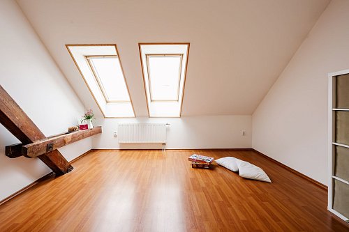 Byt s dispozicí 4+kk o výměře 114 m² se nachází v posledním 3.NP bytového domu. Tento byt byl kolaudován v roce 2008 a už na první pohled vás zaujme přiznanými dřevěnými trámy, které prostoru dodávají osobitý charakter a hřejivost.